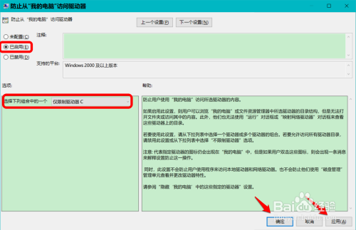 我们将其从【未设置装备摆设】点窜为【已启用】,并在选择下列组合中的一个框中选择【仅限制驱动器 C】,再点击:应用 - 确定,退出当地组策略编纂器。