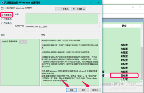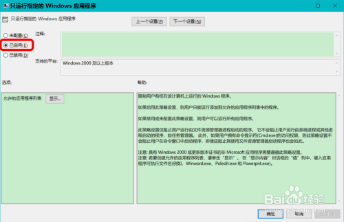 在打开的 只运行指定的Windows应用程序 窗口中,我们看到运行状况为【已启用】;