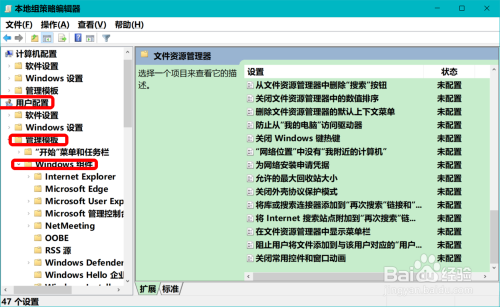 在当地组策略编纂器窗口中,睁开【用户设置装备摆设】-【办理模板】-【Windows组件】-【文件资本办理器】;