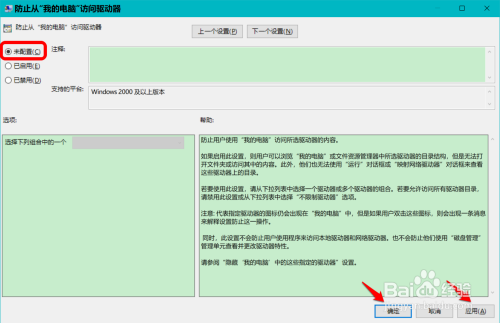 我们从头进入当地组策略编纂器窗口,将防止从我的电脑拜候驱动器 从【已启用】点窜为【未设置装备摆设】,点击:应用 - 确定,退出当地组策略编纂器。