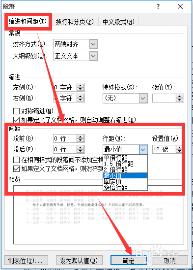 在段落对话框中,选择缩进和间距选项卡。然后鄙人面的间距一栏,可以设置段前和段后的间距;行距的设置有多个选项,具体按照需要调节。都设置完当作后,点击确定按钮。