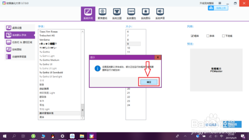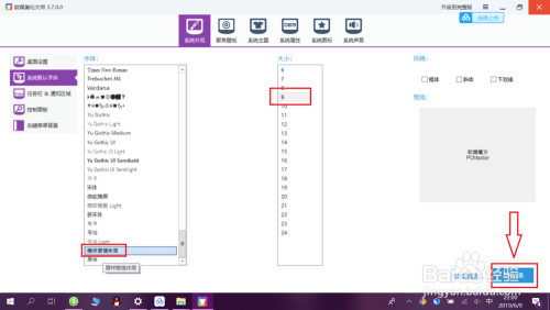 选择“字体以及字号”,点击“应用设置”——“确定”即可更改字体。