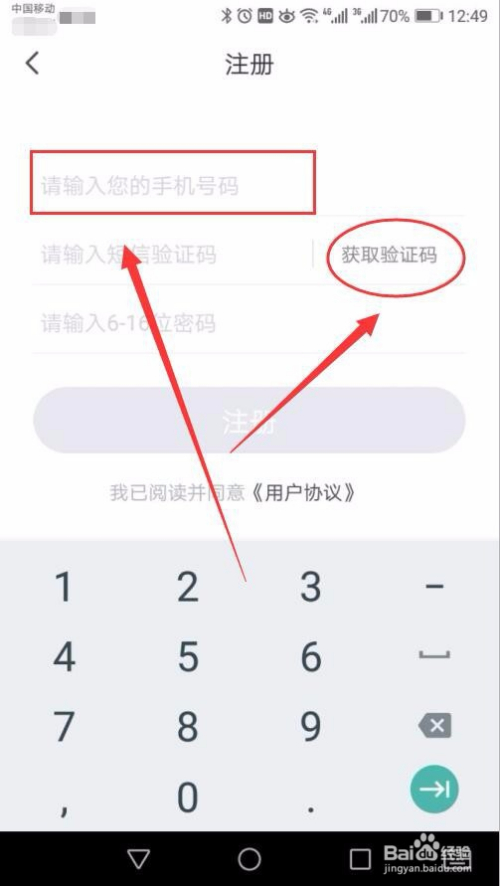 注册界面中,输入本身的手机号码,点击获取验证码按钮。