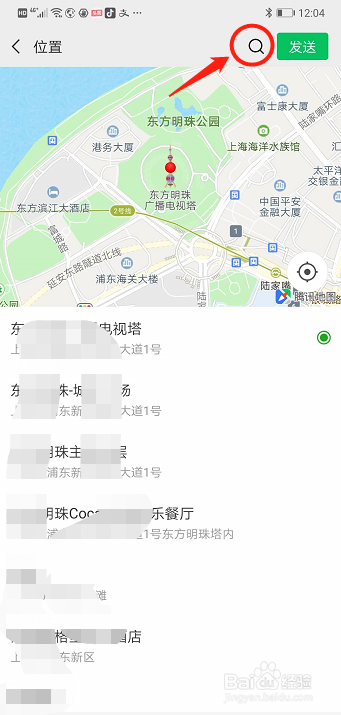 若是你想要发送的定位不在你当前位置,点击“放大镜”图标搜刮定位;