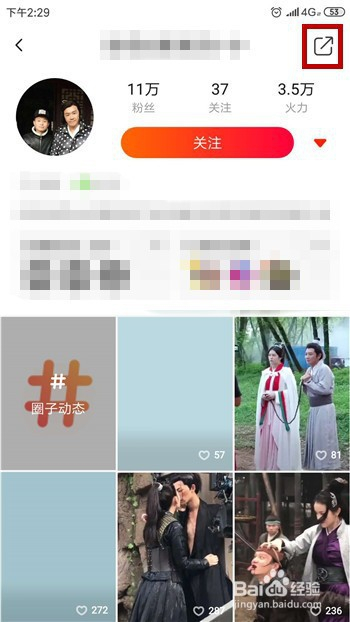 在他的小我本家儿页的右上角有个【分享】功能,点击打开分享界面。