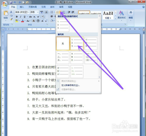 点击编号的下三角按钮,鄙人拉菜单中选择数字编号点击如下图所示。