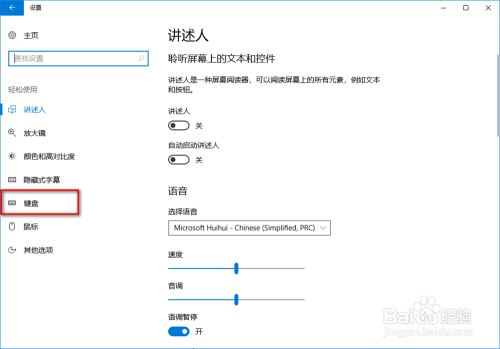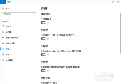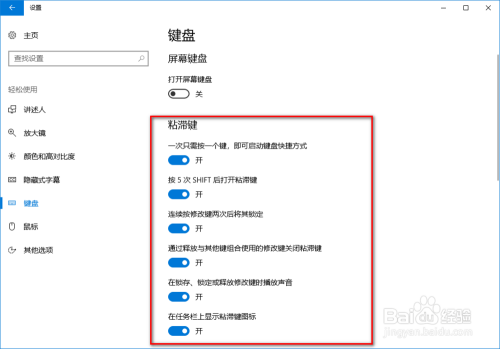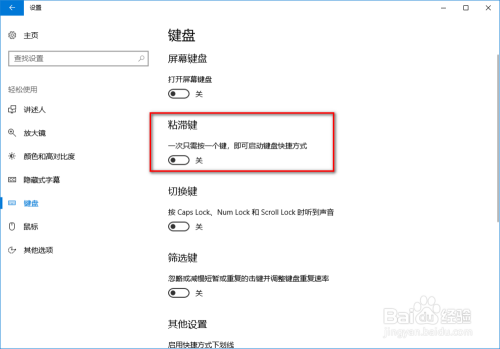 点击开启粘滞键下的开关,由封闭状况点窜为打开状况;
