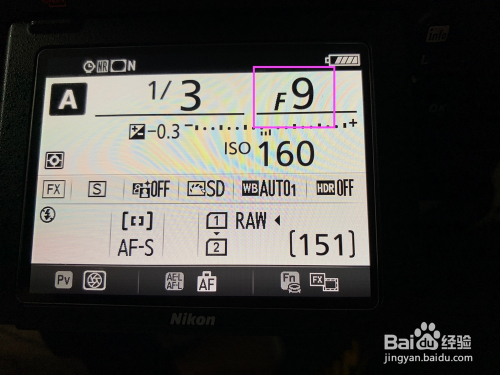 2.以尼康相机为例,就是把图中的A(A为光圈英文的缩写“Aperture”)瞄准白条,便是光圈优先模式