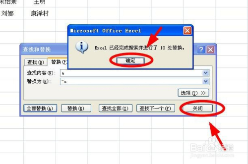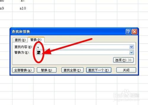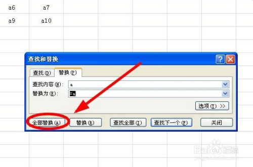 在“查找和替代”对话框中的“查找”后面输入“a”,“替代为”后面输入“=a”