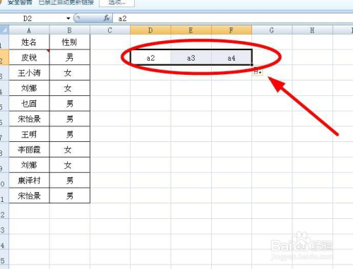 在方针单位格D2-F2平分别输入“a2”“a3”“a4”