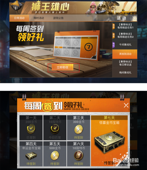 每周日常签到可以获得金币可以采办道具,服饰币可以采办服装.
