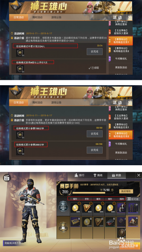 赛季特训1裁减敌手可以堆集手册积分,和赛季特训2累计分钟数也能获到手册积分,赛册积分主要在于每次升阶之后,可以获得金币,兵团币,服装,每阶获得福利都纷歧样