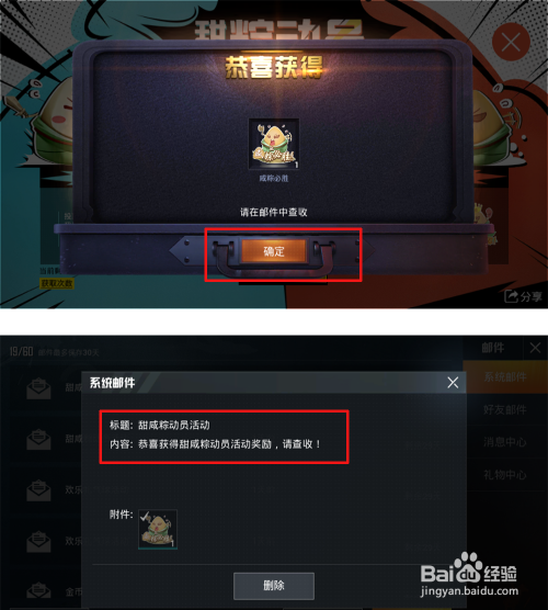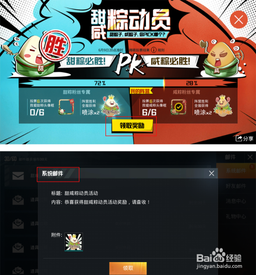 选择之后会获得咸粽必胜喷涂道具点击“确定”后会在邮件中可以查收到