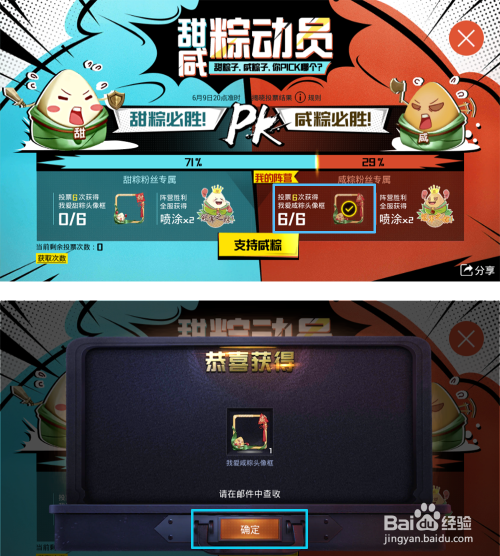 每次活动投票会提醒当作功投票6票之后会获得粽子专属头像框