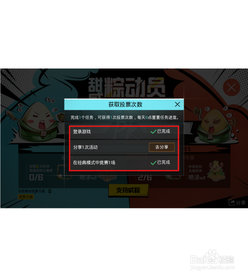 天天登岸游戏,分享活动到微信里或QQ里及在经典模式中竞赛都可以获得投票1次.