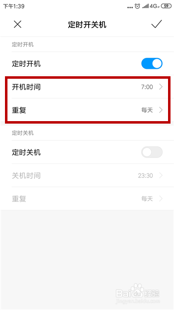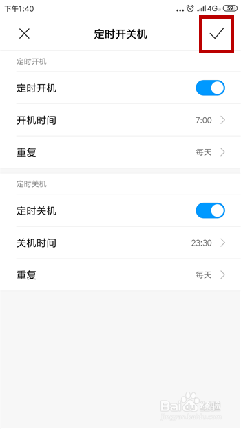 同样的体例设置按时关机,设置好后点击右上角的【√】保留开关机的设置。
