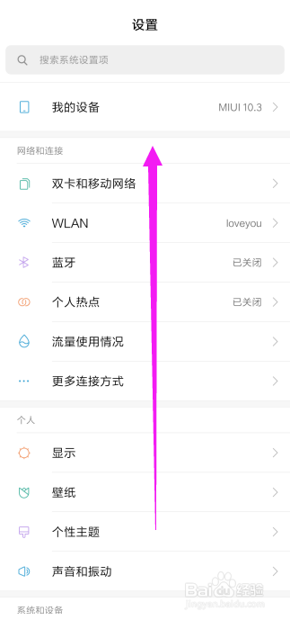 这时辰,你就来到小米手机设置的页面了,你需要做的是,标的目的上滑脱手机屏幕,如图所示