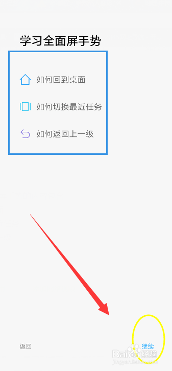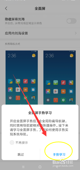 这时,会提醒你进行周全屏手势进修,点击手势进修,如图所示