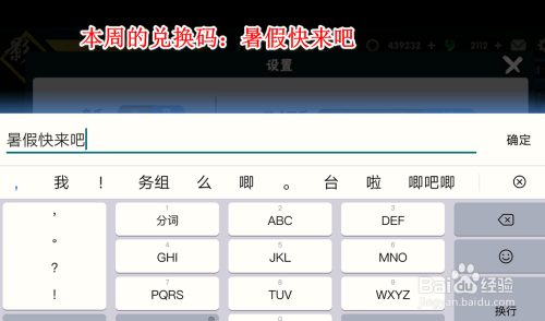 在兑换码输入界面中,我们调动系统输入法输入兑换码口令/