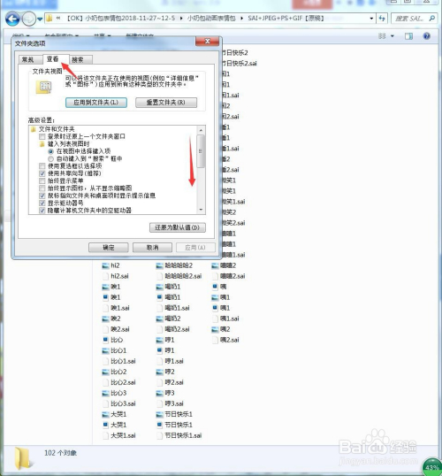 4、跳出文件夹选项,点击查看,滚轮往下拉。