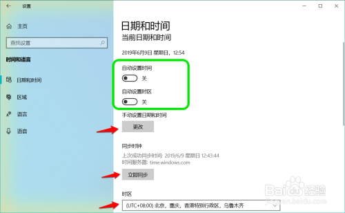 点击主动设置时候和主动设置时区按纽使之处于【关】的位置,我们即可看到
