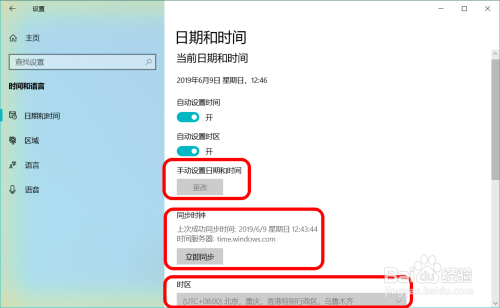 手动设置日期和时候【更改】、同步时钟【当即同步】和时区调整均呈灰色,即为不成调整状况;
