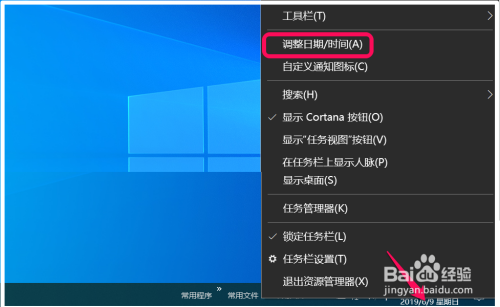 在系统桌面右下角的日期和时候显示图标上,右键点击,在右键菜单中点击:调全日期/时候(A);