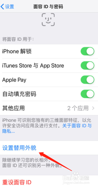 打开手机设置,点击“面庞ID与密码”——“重设面庞ID”;