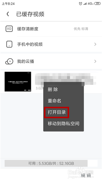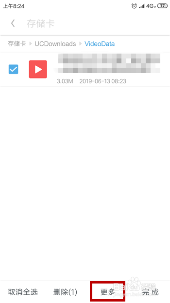 打开了缓存目次后找到要转换视频格局的文件,长按后点击下方的【更多】。