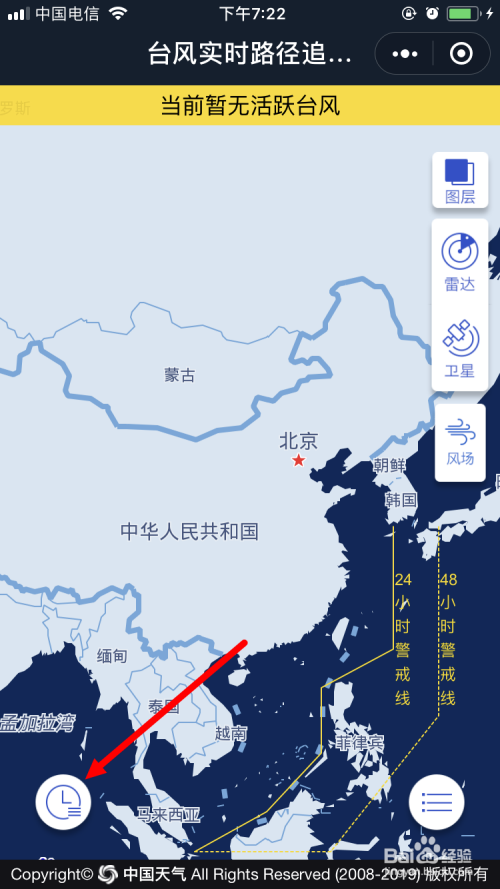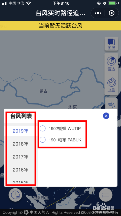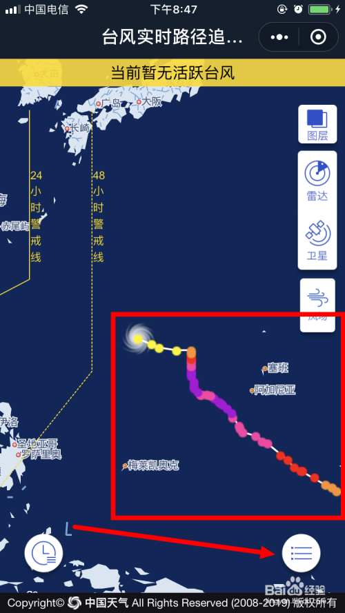 好比我们选择 蝴蝶1902 ,就会呈现台风的路径。再点击图片右下角的图标。