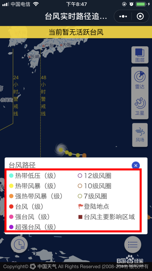 此时弹出的是台风路径中分歧颜色的小点暗示的意思。