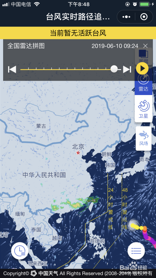 鄙人一个页面可以看到台风查询,点击进去。这里可以查询到台风当前的地点地、台风影响规模以及台风路径。