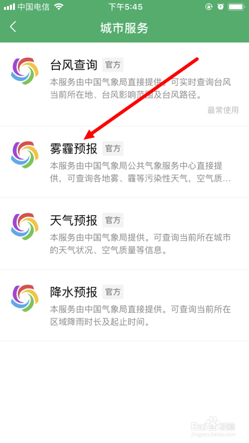 之后,点击 雾霾预告 。这里可以查询各地的雾霾环境,以及空气质量环境。