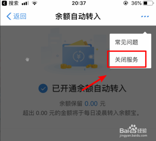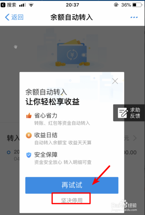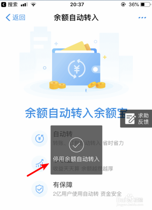 点击后页面会提醒我们停用余额主动转入,这时就可以封闭余额主动转入余额宝。
