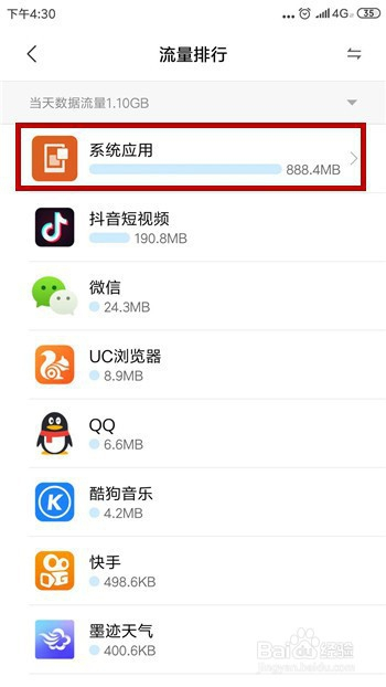 在流量利用环境中首先显示的是数据流量是利用环境,包罗系统应用和其他的应用软件的数据流量利用环境,我们可以点击【系统应用】。