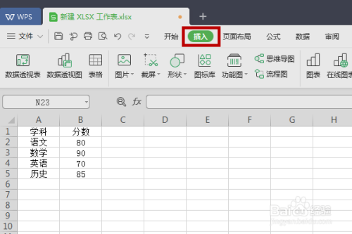 新建一个WPS表格,在表格中小编新建了一些各科成就的数据,我们以这些数据为例做出数据图表。