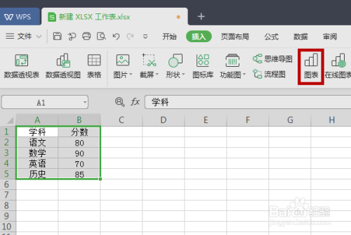 接下来我们选中要做数据表格的区域,选好区域后点击【插入】菜单下方的【图表】功能。
