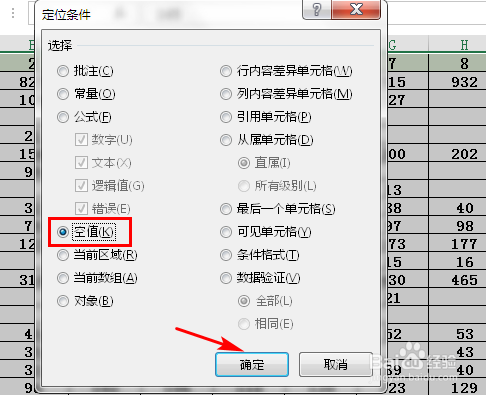 在“定位前提”对话框中选择“空值”,单击【确定】按钮。此时表格中所有的空白单位格就被选中了。