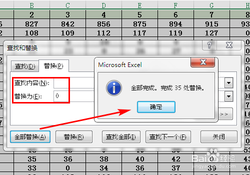在“查找和替代-替代”对话框的“查找内容”框中为空白,在“替代为”框中输入“0”,单击【全数替代】按钮,然后会弹出替代完当作的提醒框,单击【确定】按钮,完当作。