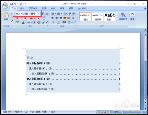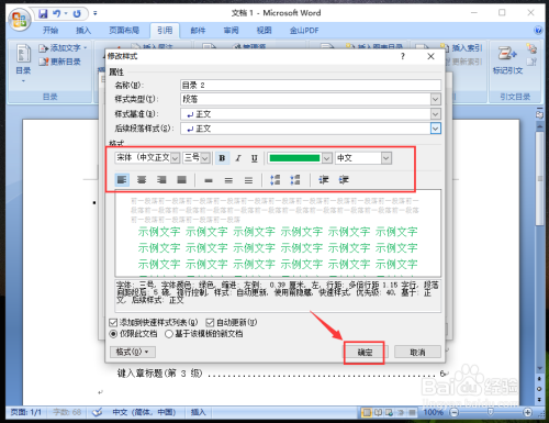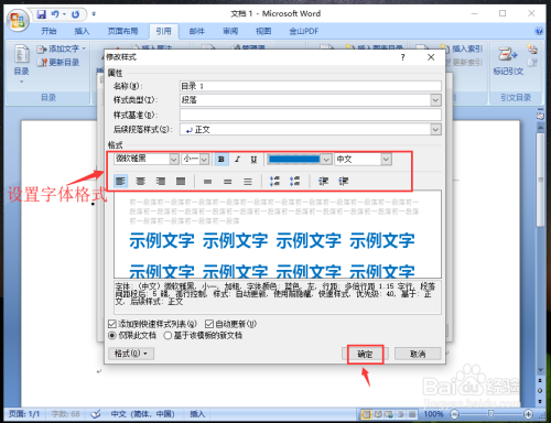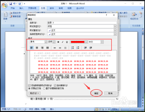 进入点窜样式窗口,设置层级“目次1”的字体格局,好比:字体,字体大小,字体加粗,字体颜色等,再点击【确定】。