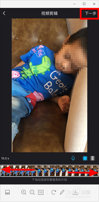 从相册选择一个视频或一张照片(最好是视频),鄙人方视频轨道上摆布拖动调整视频显示内容,然后点击“下一步”。