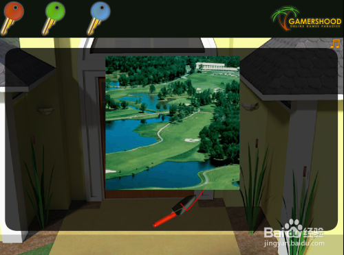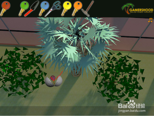 场景4。用铁锤砸取树丛中的高尔夫球,获得粉色钥匙。
