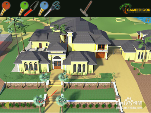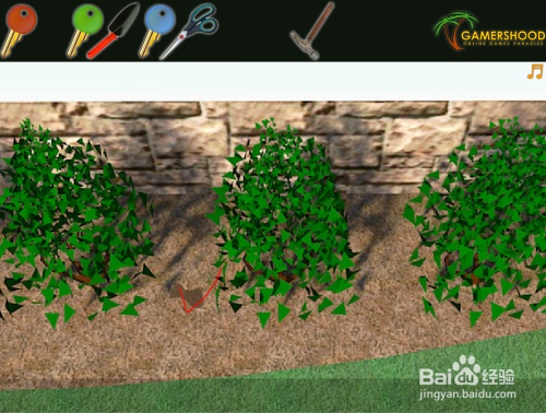 场景1。用铁铲挖取花丛下面,获得黄色钥匙。