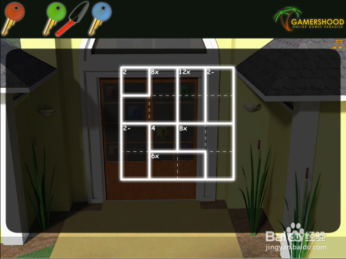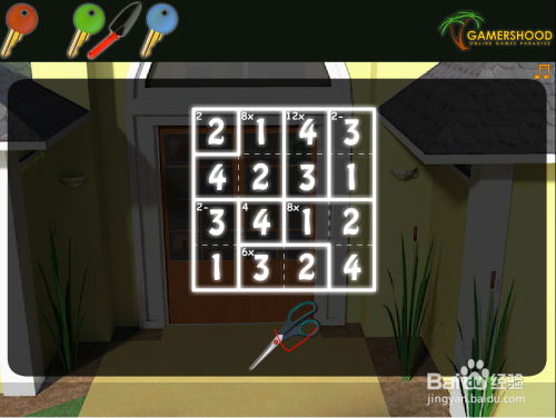 场景1。绿色钥匙打开绿色门锁,完当作数字游戏,获得铁剪。