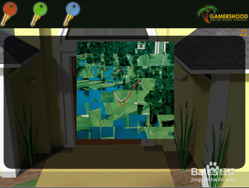 场景1。红色钥匙打开红色门锁,完当作拼图游戏,获得铁铲。