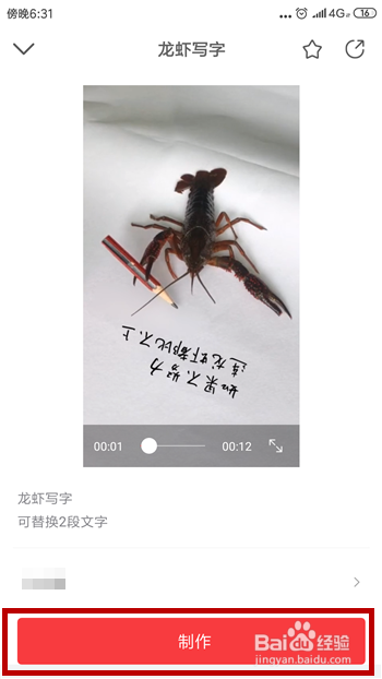 然后就可以起头建造视频了,视频上是龙虾写的字,我们可以对文字进行点窜,点击文字部门。