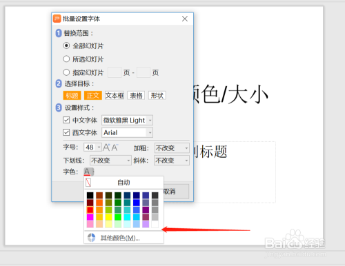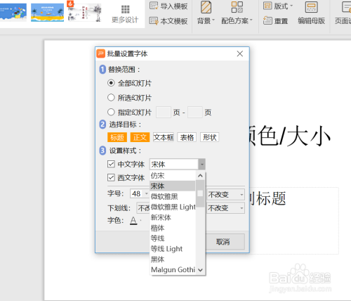 批量点窜ppt中的字体、大小、颜色等?当我们输入好ppt内容后,城市去点窜字体美化,若是每页字体都要点窜,将长短常大的工作量,其实我们可以利用PPT自带批量设置字体功能,下面小编就来介绍一下具体操作。