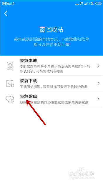 在收受接管站里有三个分类可以恢复,我们需要点击此中的【恢复歌单】。