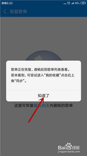 接下来就会显示正在恢复,若是歌单里的歌曲比力多恢复的时候会长一点。