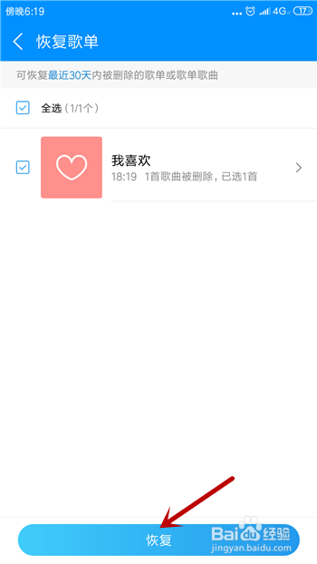 然后就能看到我们比来30天删除的歌单,选择后点击底部的【恢复】。